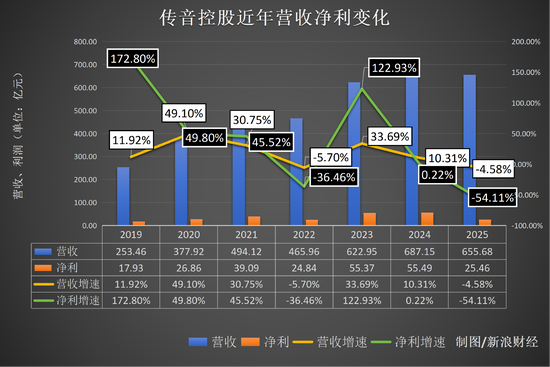 《BUG》栏目梳理发现,自2019年在科创板上市以来,传音控股多年保持较快的业绩增速,此前仅在2022年出现过营收和净利双双下滑的情况。