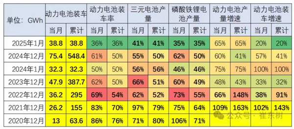 IT之家 2 月 23 日消息,乘联分会崔东树发文,透露 2025 年 1 月的锂电池装车 38.8 GWh,同比增 20%;三元电池装车同比下降 33%,占比 22%,低于同期;而磷酸铁锂电池装车同比增速 53%,占比 78%,三元电池增长有所放缓。