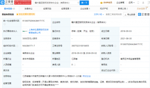 企查查信息显示,该公司成立于2018年,注册资本5000万元人民币,经营范围包含:股权投资,投资管理。