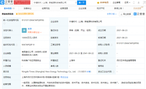 宁德时代于上海成立新公司,注册资本1亿元快报