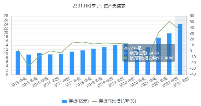 自从2021年因“国潮”崛起红利之后,李宁的业绩很快就出现了高光消退的逆转,渠道库存开始明显积压。2022年,李宁的存货24.28亿元,同比大幅增长36.96%,到了2023年中期,存货依然有21.2亿元,环比只减少了12.7%,在加大了促销力度后依然没有消化多少库存。