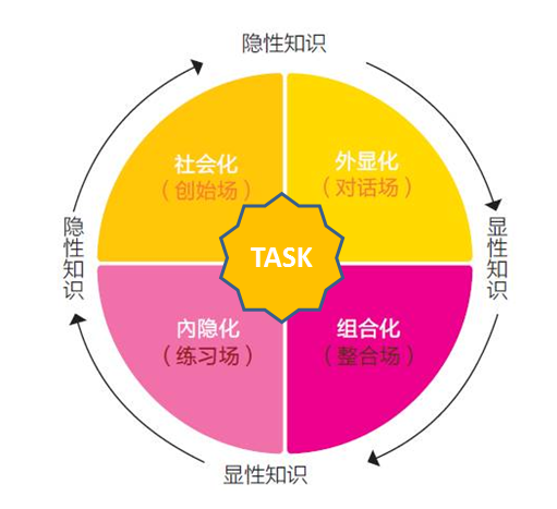 以上是KM大的结构与愿景,而具体到愿景的落实,网易游戏KM背后,其实还有一套完整的理论体系的支撑——野中郁次郎的SECI模型,以及他和同事提出的 “场(Ba)理论”。