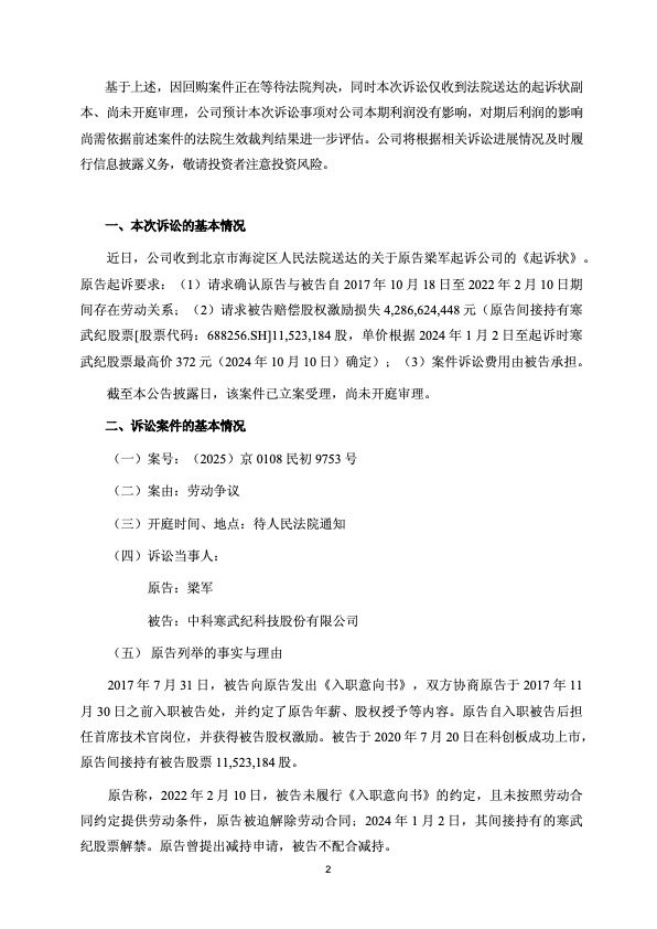 (3)案件诉讼费用由寒武纪承担。截至本公告披露日,该案件已立案受理,尚未开庭审理。