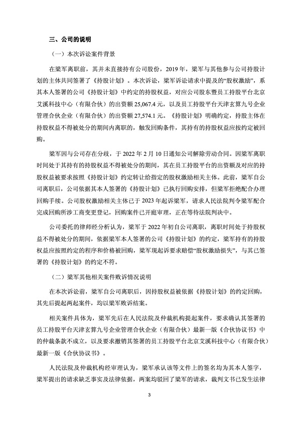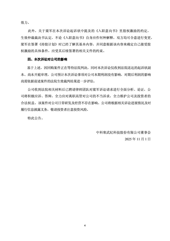 2023年,寒武纪的股权激励相关主体已先行起诉梁军,要求他配合办理前述股权回购的工商变更手续,该案目前已开庭,正在等待判决。