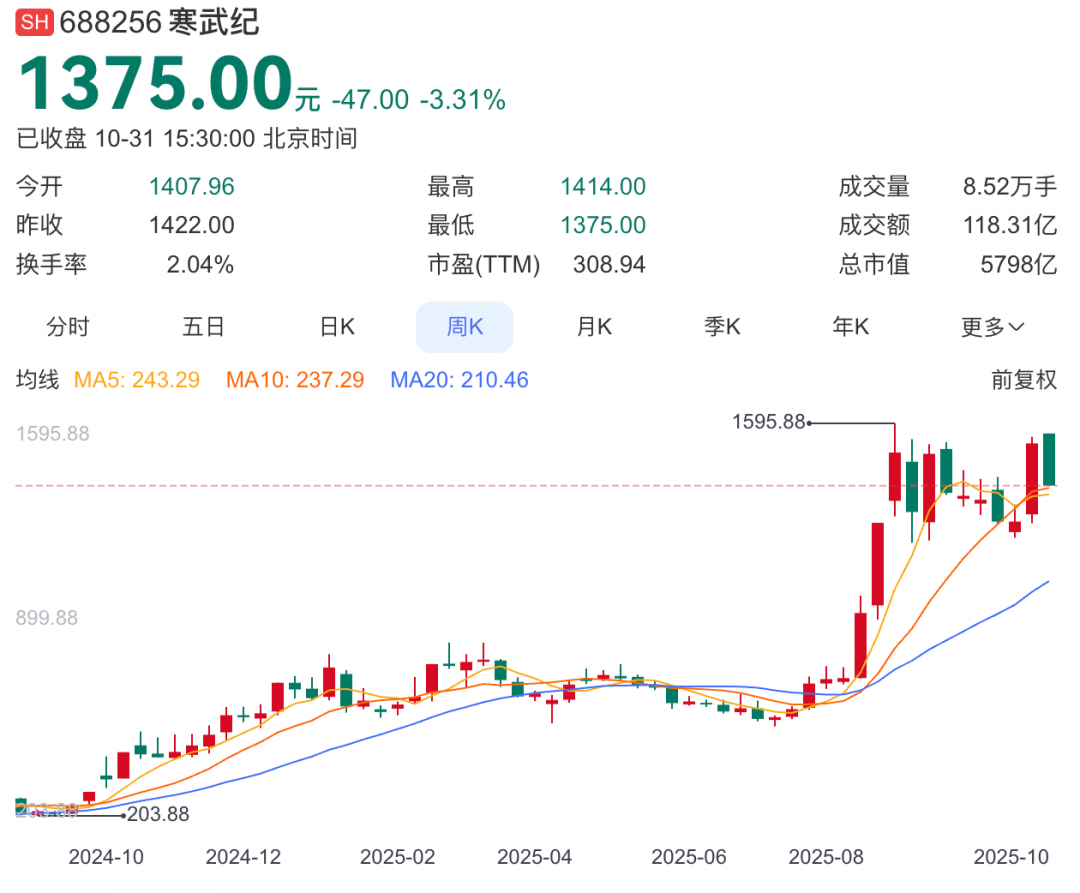 今年来,寒武纪股价暴涨,从2024年10月间的300多元/股涨至近期的超1300元/股。