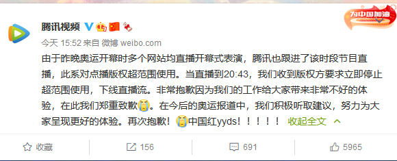 今日下午,腾讯视频官方微博发布了致歉声明,称收到版权方要求立即停止超范围使用,下线直播流。