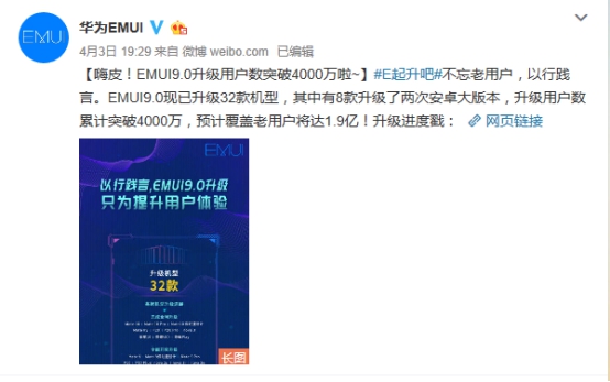 4月3日,华为EMUI微博公布了EMUI9.0升级成果,在6个月的时间内,目前EMUI9.0 现已对32款产品升级安卓9.0版本,其中还包含8款旗舰机的二次升级,已经升级用户数达到4000万,预计全球超过1.9亿老用户可享受到基于安卓9.0深度定制的EMUI 9.0,将智慧百科、手机投屏、Huawei share 、AI翻译等优势功能升级给老用户使用。