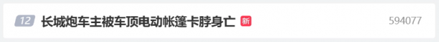 5 月 11 日车主操作帐篷升顶时发生意外,长城汽车官方也未有新的回应,网友反映成都一长城炮汽车车主被电动车顶帐篷卡脖不幸身亡。