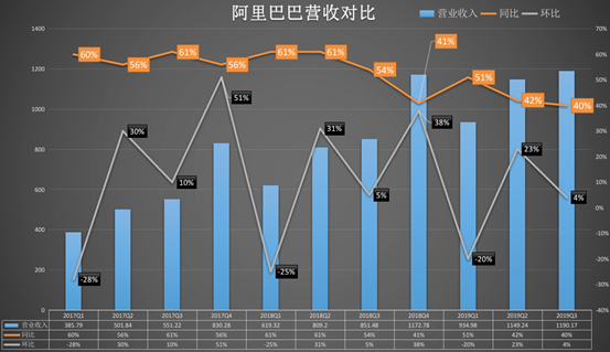这一次,阿里的财报数据依旧亮眼:截至2019年9月30日,第二季度营收1190.2亿元,去年同期为851.50亿元,同比增长40%;其中,归属普通股股东的净利润为725.40亿元,去年同期为200.30亿元,同比增长262%……