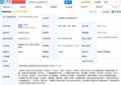 【TechWeb】企查查APP显示,11月25日,上海栩泥文化传媒有限公司成立,法定代表人为桂震宇,注册资本900万元人民币,经营范围包含:软件开发;人工智能基础软件开发;人工智能应用软件开发;演出经纪;广播电视节目制作经营等。