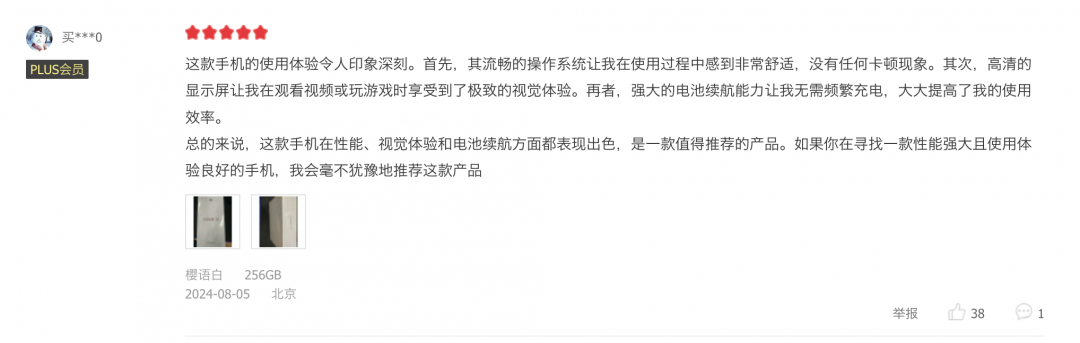 总的来说,这款手机在影像、视觉体验和电池续航方面都表现出色,是一款值得推荐的产品。如果你在寻找一款实力出色且使用体验良好的手机,这款产品很值得推荐。而且很多用户同样给出了诸如“外观设计上手很轻薄,重量也很合适,拍照效果还可以,续航充电很不错”之类的正面评价。