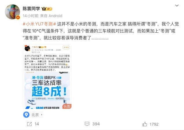 不过,这项数据遭到了知名车评人陈震的质疑。陈震表示:“这并不是小米的冬测,而是汽车之家 搞得所谓“冬测”,我个人觉得在10℃气温条件下,这就是个普通的三车续航对比测试,而如果加上“冬测”或“准冬测”,就比较容易误导消费者了。”