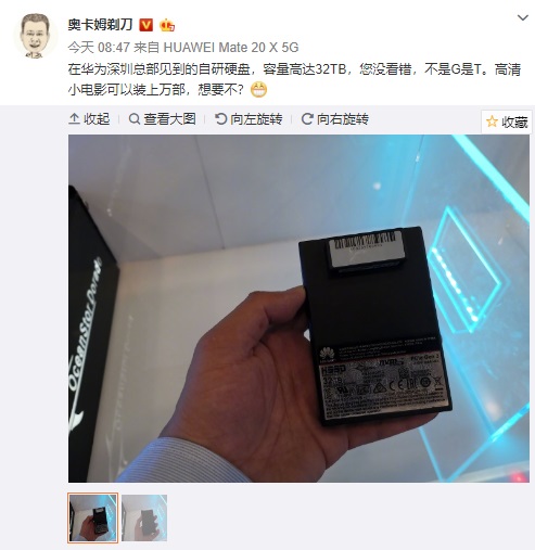 大家对于华为的印象还是属于通信设备供应商,不过近日微博科技大V奥卡姆剃刀通过微博曝光了华为的另一款新品,这次不是手机等移动产品,而是一块容量高达32TB的硬盘。