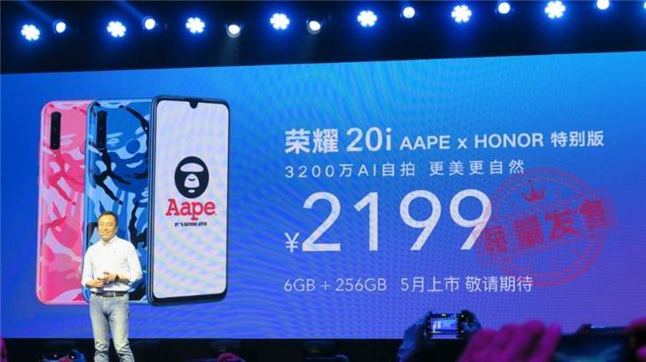 售价方面,荣耀20i总共有三个存储版本,6+64GB版售价1599元,4+128GB版售价1599元,6+128GB版售价1899元,6+256GB版售价2199元,将于4月18日正式开售。荣耀20i AAPE特别版(6+256GB)售价2199元,将于5月份上市。