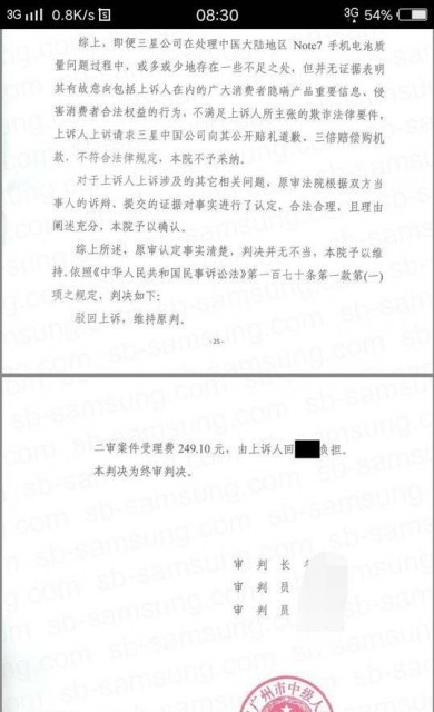 4月1日,封面新闻记者从北京三星Note7炸机机主回先生处获悉:其起诉三星中国公司三倍赔偿爆炸的手机并涉嫌欺诈案,日前由广州市中级人民法院作出终审判决,维持原判。
