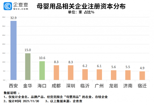 从城市分布来看,企查查数据显示,母婴用品相关企业数量排名前三的城市是西安市、金华市、海口市,分别有企业32.9万家、15.0万家、10.6万家。其次是成都、深圳、临沂、广州等城市。