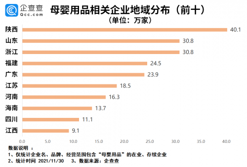 从地域分布来看,企查查数据显示,目前我国在业、存续的母婴用品相关企业主要分布在陕西、山东、浙江等省份。其中陕西省的企业量排名全国第一,为40.1万家。此外,山东、浙江的母婴用品相关企业均为30.8万家,分列二三位。