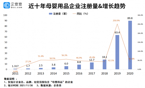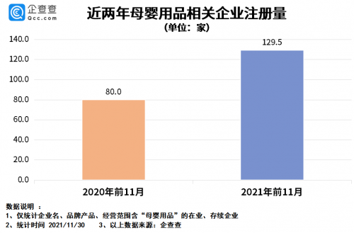从今年的注册量来看,企查查数据显示,2021年前11月,母婴用品相关企业共新注册129.5万家,同比增长了61.9%。