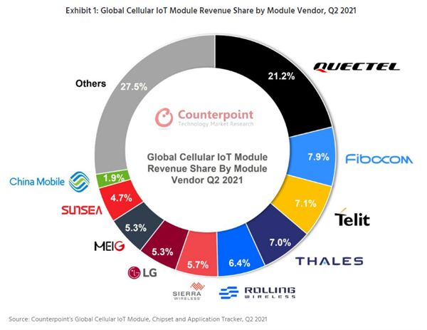 日前,统计机构Counterpoint发布了对二季度全球IoT市场的统计报告。注意,这里统计的是模组,而非终端产品。