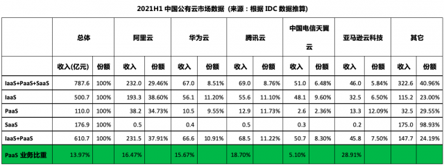 PaaS市场方面,2021年上半年,阿里云PaaS收入38.2亿元、亚马逊收入13.3亿元、腾讯云收入12.9亿元、华为云10.5亿元。