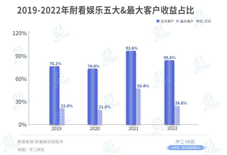 在「不二研究」看来,由于耐看娱乐大部分收益来自网剧,需要源源不断的输出。不仅要面临收入单一带来的风险,还要注重内容输出的质量。此外,耐看娱乐的收入基本源于五大客户,如若合作生变,则将直接影响其营收。