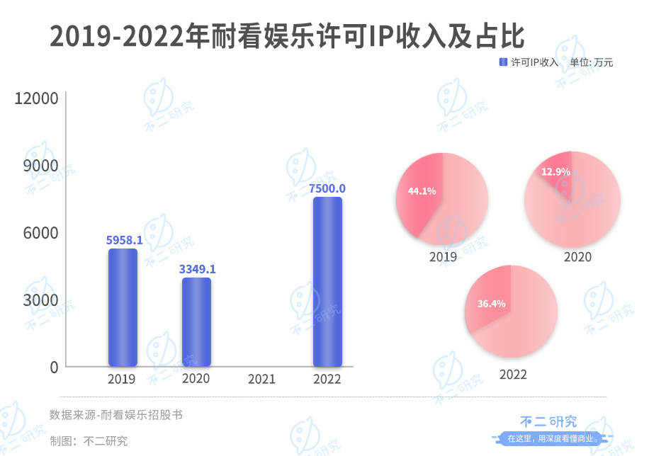 据耐看娱乐招股书显示,2019-2020年,许可IP的收入分别为5958.1万元和3349.1万元,分别占总收益的44.1%和12.9%,2021年的收益数据并未明示,2022年,许可IP的收入为7500万,占总收益的36.4%。