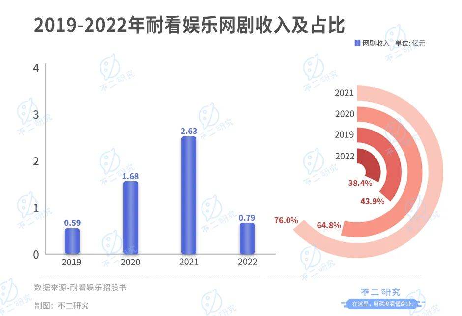 据招股书显示,2019-2022年,耐看娱乐网剧的收入分别为5914.9万、1.68亿、2.63亿和7913.1万元,分别占总收益的43.9%、64.8%、76.0%和38.4%,是耐看娱乐的主要收入来源。