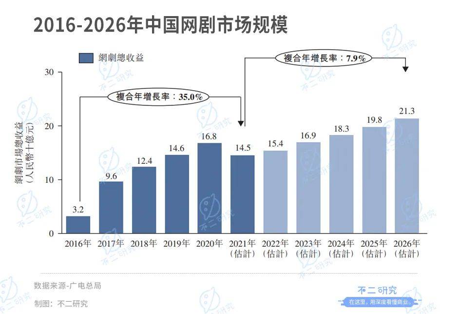据广电总局数据显示,网剧收益由2016年的32亿元大幅增至2020年的168亿元,复合年增长率为50.9%。预期将稳步增长,2025年将达到198亿元,2021年至2026年的复合年增长率7.9%。