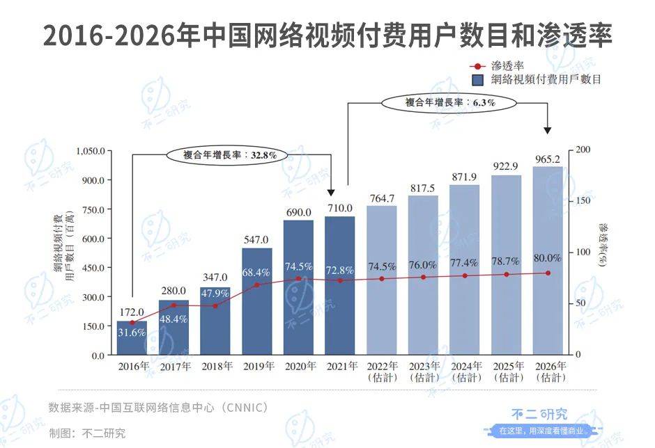 由于爱奇艺、优酷、腾讯视频、芒果TV、哔哩哔哩等主要网络视频平台的崛起,据中国互联网络信息中心(CNNIC)数据显示,2021年中国网络视频付费用户整体渗透率高达72.8%,渗透率将在2026年将达到80.0%。付费用户数目预期在2026年将达到96520万名,2021年至2026年复合年增长率为6.3%。