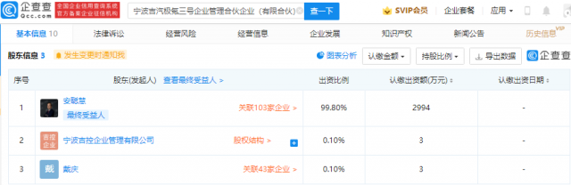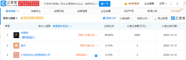 执行事务合伙人同为宁波吉控企业管理有限公司,二者皆由安聪慧、宁波吉控企业管理有限公司、戴庆共同持股,宁波吉汽极氪二号企业管理合伙企业(有限合伙)、宁波吉汽极氪三号企业管理合伙企业(有限合伙)成立。