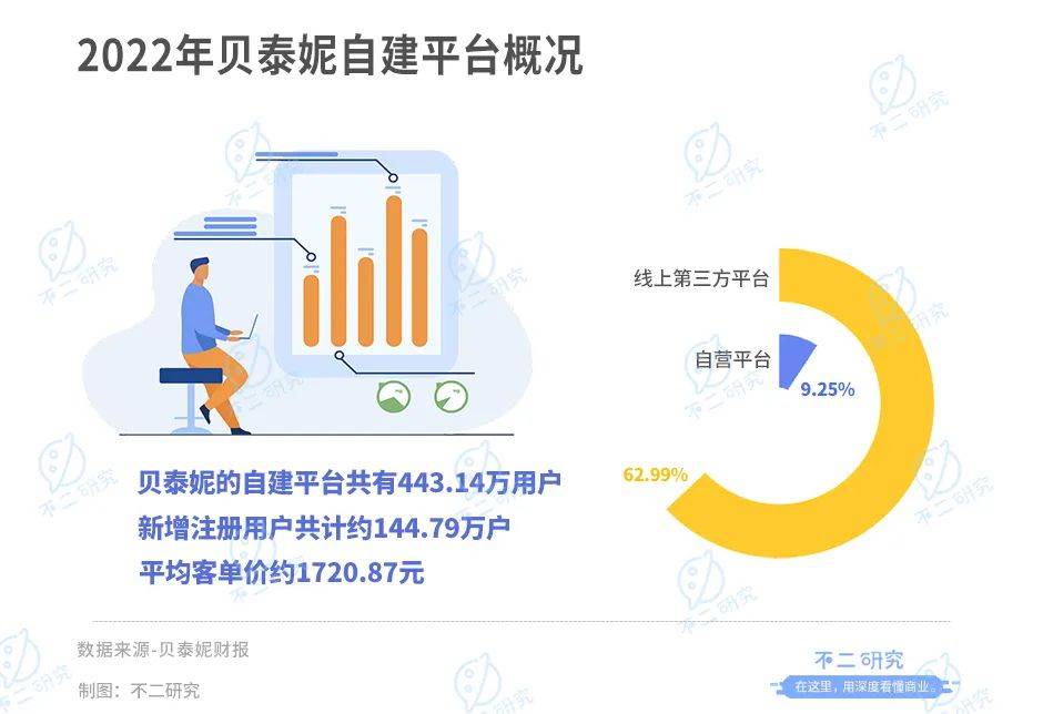 截至2022年年底,贝泰妮的自建平台共有443.14万用户,新增注册用户共计约144.79万户;平均客单价约1720.87元。年报显示,在线上渠道收入中,自营平台的销售占比已达到9.25%;通过线上第三方平台的销售占比为62.99%。