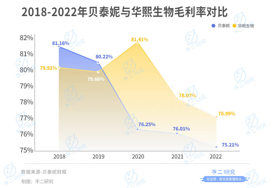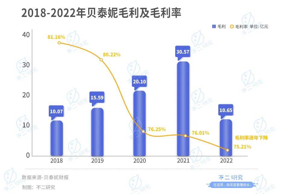 但业绩向好背后,亦暗藏颓势。年报显示,2018年-2022年,贝泰妮毛利润分别为10.07亿元、15.59亿元、20.10亿元、30.57亿元、10.65亿元;毛利率分别为81.16%、80.22%、76.25%、76.01%、75.21%,尽管一直维持较高水平,但却呈现逐年下降的趋势。