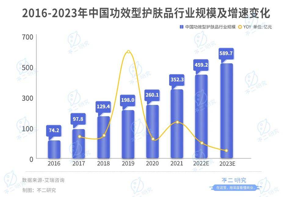 欧睿国际显示,2022年我国皮肤学级护肤品(功能性护肤)市场规模达到285.9亿元,同比增长6.8%。根据艾瑞咨询,未来三年功能型护肤市场规模将以29.4%的年均复合增速继续增高,并于2023年达到589.7亿元。