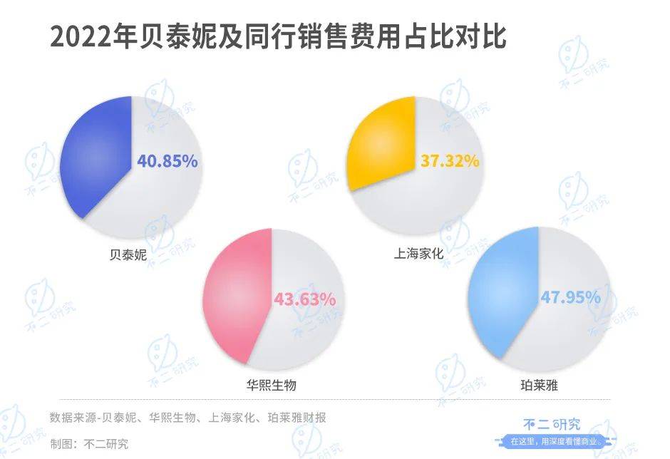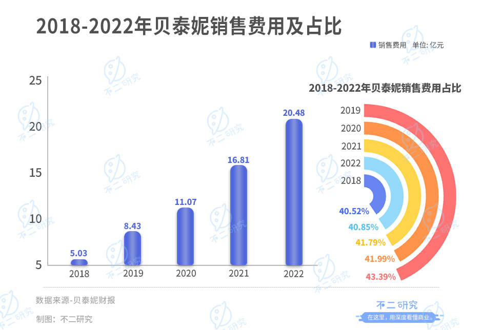财报显示,贝泰妮销售费用率常年高于40%。2018年-2022年,贝泰妮销售费用分别为5.03亿元、8.43亿元、11.07亿元、16.81亿元和20.48亿元,均高于净利润水平;销售费用占营收比重分别为40.52%、43.39%、41.99%、41.79%和40.85%。