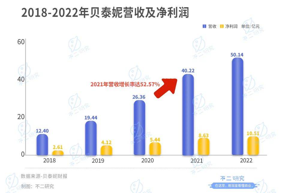 年报数据显示,2018年-2022年,贝泰妮营收分别为12.40亿元、19.44亿元、26.36亿元、40.22亿元、50.14亿元,其中2021年增长率达52.57%;净利润分别为2.61亿元、4.12亿元、5.44亿元、8.63亿元、10.51亿元,其中2021年增长率高达58.77%。