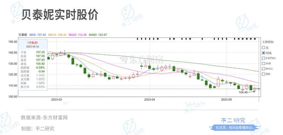 3月30日,贝泰妮年报公布后的首个交易日,其股价上涨5.61%。截止5月16日收盘,贝泰妮股价报107.00元/股,对应市值453.3亿元。对比2021年的市值高点,贝泰妮当前股价已近乎腰斩,市值蒸发超700亿元。