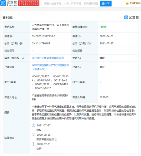【TechWeb】企查查APP显示,7月27日,OPPO广东移动通信有限公司“天气质量的提醒方法、电子装置及计算机存储介质”专利获授权,公开号为CN111479018B。