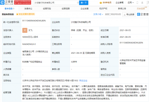 【TechWeb】企查查APP显示,8月5日,沙龙智行科技有限公司成立,法定代表人为文飞,注册资本5亿元人民币,经营范围包含:信息系统集成服务;销售汽车、电气设备、音响设备、汽车零配件;互联网数据服务;信息处理和存储支持服务等。