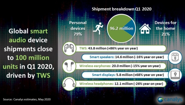 来自分析机构Canalyst的一份最新报告显示,在今年一季度,全球智能音频设备(耳机/音响)的总出货量为9620万件,个人音频设备占比79%,家庭音频设备占比21%,前者同比增加19.4%。