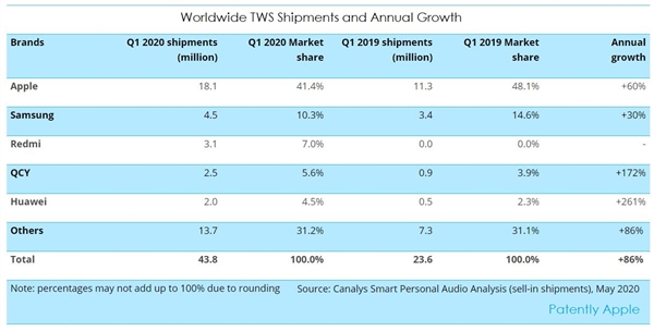 个人音频设备出货数量的增加主要得益于苹果公司的AirPods无线耳机,它的出货超过了四大友商(三星、Redmi、QCY和华为)之和。