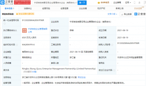 【TechWeb】企查查APP显示,8月19日,宁波吉控吉聚伍号企业管理合伙企业(有限合伙)成立,执行事务合伙人为宁波吉控企业管理有限公司,注册资本6501万元人民币,经营范围包含:企业管理;企业管理咨询;社会经济咨询服务。