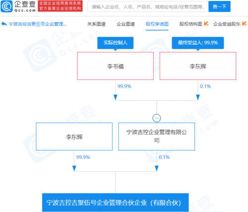 企查查股权穿透显示,该公司由李东辉、宁波吉控企业管理有限公司共同持股,疑似实际控制人为李书福。