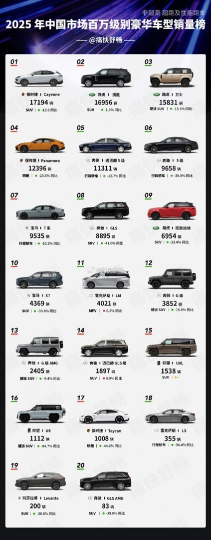 1月26日消息,汽车博主“痛快舒畅”日前公布了2025年中国市场百万级别豪华车型销量榜。