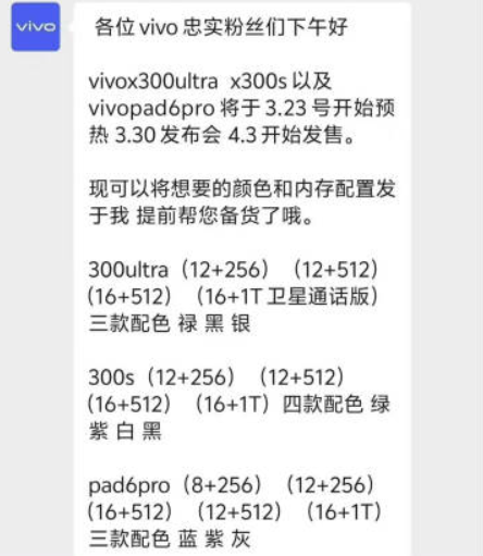 据知名数码博主@Oneline科技 最新放出的一张聊天截图显示,与此前曝光的消息基本一致,全新的vivo X300 Ultra将于3月23日开始预热,3月30日举办发布会,4月3日正式发售。根据流出的信息,X300 Ultra将提供12+256、12+512、16+512以及16+1TB卫星通话版四个内存版本,配色涵盖绿、黑、银三款选择。值得一提的是,此次发布会除了vivo X300 Ultra,还将推出X300s以及Pad6 Pro等多款设备,其中vivo X300s拥有四种存储配置,提供绿、紫、白、黑四款配色。Pad6 Pro拥有五个存储组合,配色包括蓝、紫、灰三色。