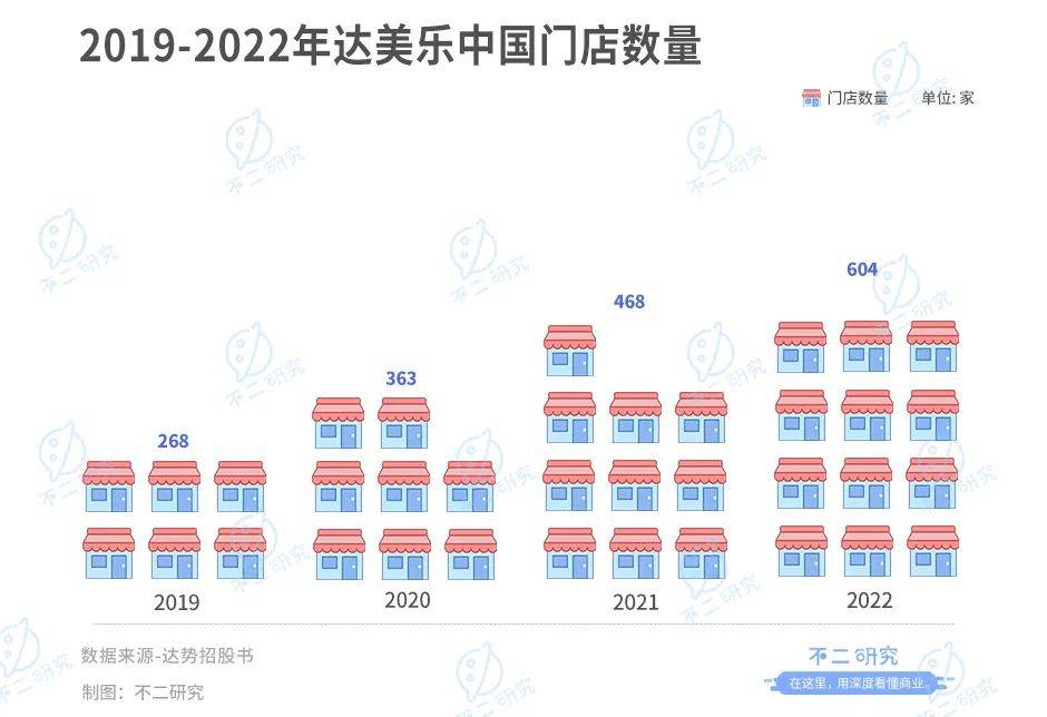 按门店数目计算,2019-2022年,达美乐中国共有门店数量268家、363家、468家和604家。