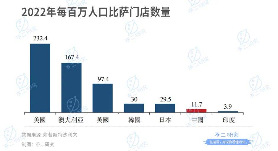 按2022年每百万人口比萨门店数量来计,美国为232.4家,澳大利亚为167.4家,英国为97.4家,而中国仅为11.7家。