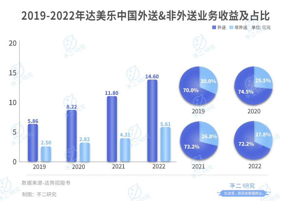 2019-2022年,达美乐中国四年营收47.36亿元,但超7成收入来自外卖。去年,其来自外送订单的收入为14.60亿元,当期营收占比达72.2%。