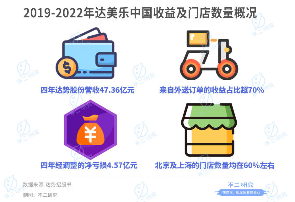 据招股书显示,2019-2022年,达美乐中国收益为47.36亿元,经调整净亏损为4.57亿元,来自外送订单的收益占比超70%,其中北京及上海的门店数量均在60%左右。