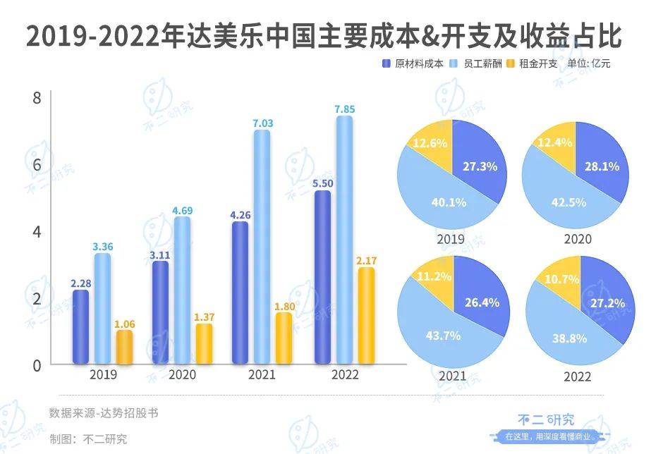 据招股书显示,2019-2022年,达美乐中国的原材料及耗材成本分别为2.28亿、3.11亿、4.26亿和5.50亿,占总收益的27.3%、28.1%、26.4%和27.2%。
