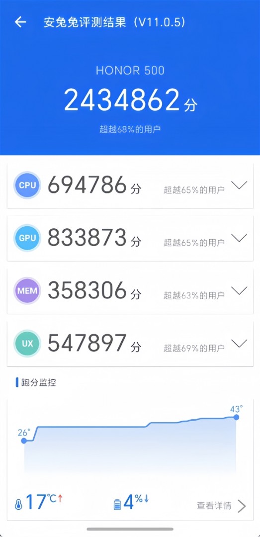 据荣耀官方最新发布的信息显示,与此前曝光的消息基本一致,全新的荣耀500将全系搭载骁龙8系旗舰芯片,是同档位唯一标配骁龙8系旗舰芯片的手机。其中,荣耀500标准版将搭载高通骁龙8s Gen4,Pro版搭载高通骁龙8至尊版。而从此前曝光的跑分成绩来看,荣耀500安兔兔跑分为2434862,荣耀500 Pro安兔兔跑分为3232068,同档位性能遥遥领先。此外,荣耀终端股份有限公司产品线总裁方飞表示,性能的意义远不止于当下的流畅,它更关乎一部手机长久的生命力,强大的性能底座意味着面对未来系统更新、更复杂的AI模型以及更高要求的游戏画质时依然从容自如。